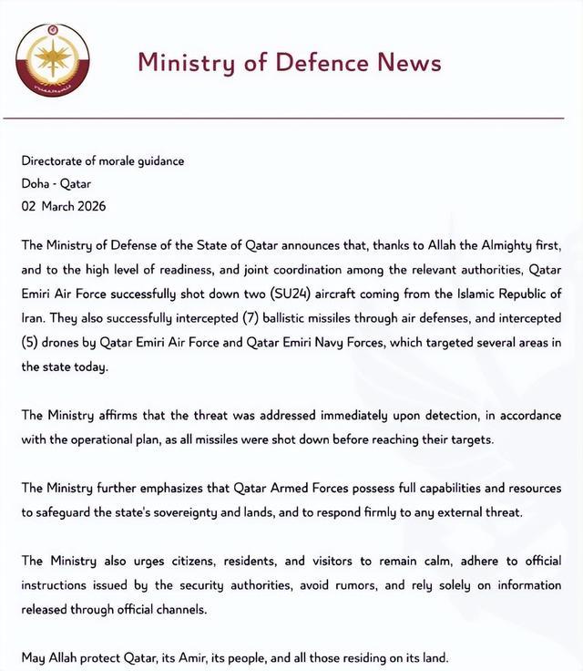 3月2日,卡塔尔军方发布了战报,当天拦截了7枚伊朗发射的弹道导弹与5架无人机,并击落了伊朗空军两架苏-24战斗轰炸机。这也是战场上首次出现有关伊朗战斗机的报道,在美国和以色列完全掌握制空权的情况下,伊朗战斗机依然能突破封锁、穿越波斯湾,背后可能是大量战斗机升空后遭遇层层拦截,最终只有寥寥几架抵达预定作战区域,这也说明在开战后72小时内,伊朗空军还在进行有组织的抵抗,以极为悲壮的方式多方向出击,以飞蛾扑火的手段为自己的祖国分担压力。